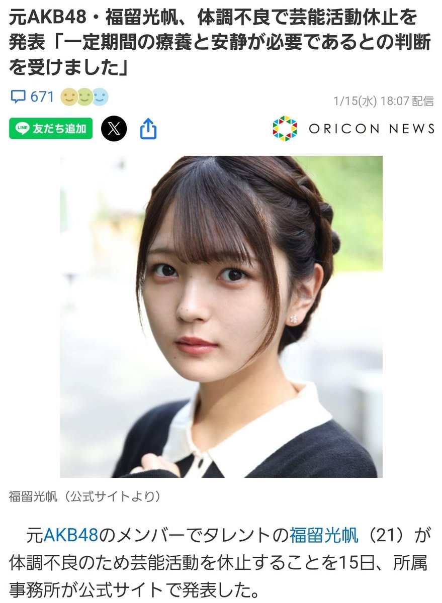 | 芸能活動休止の元AKB48・福留光帆、発表後Xに初投稿「一刻も早く元気になります」 体調不良のため芸能活動を休止することを発表した元AKB48のメンバーでタレントの福留光帆(21)が15日、自身のXを更新し、自身の言葉で活動休止に… (出典:) |