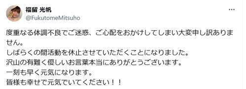 現在、福留光帆は体調不良のため、医師の診断のもと一定期間の療養と安静が必要であるとの判断を受けました。